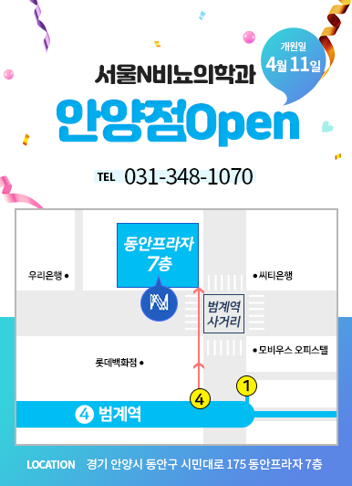 서울엔 안양점이 2022년 4월 11일부터 진료를 시작합니다. 페이지 정보 작성자 서울N 작성일22-03-21 15:05 조회1,151회 댓글0건 이전글 목록 본문 많은 관심과 성원 부탁드립니다. 감사합니다. 댓글목록 등록된 댓글이 없습니다. 이전글 목록